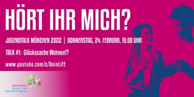 Immer noch ist der Aktionsradius für junge Menschen sehr eingeschränkt und damit auch die Möglichkeit, sich zu beteiligen. Die Online-JugendTalk-Serie „Hört ihr mich?“ will das ändern. Fünfmal kamen 2021 junge Münchner*innen mit Verantwortlichen aus Stadtpolitik und Stadtverwaltung zu ihren Anliegen ins Gespräch. Am 24. Februar 2022 startet nun die zweite Staffel. Das bewährte Format knüpft dieses Mal an den Themen aus der Münchner Jugendbefragung – „Wohnen“, „München macht Druck“ und „Partizipation“ – an. Die Gesprächsrunde hat zum Ziel, junge Münchner*innen mit Entscheider*innen aus Politik und Verwaltung in den Diskurs zu bringen und Lösungen gemeinsam anzugehen.